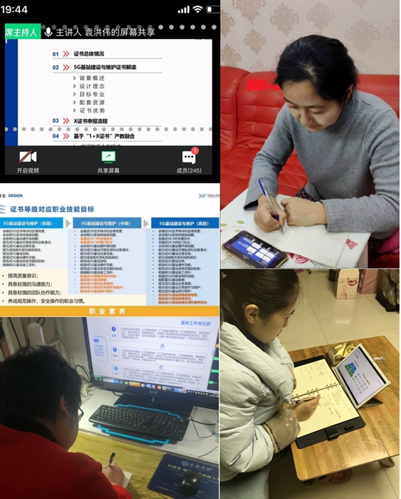 疫情防控期间,教师业务提升不停步,除了各教研室在QQ群中开展教学交流研讨,部门还统一安排了部分老师参加线上培训。部门与第三批1+X证书制度试点单位——南京中兴信雅达信息科技有限公司充分沟通交流,朱伶俐、蔡凤丽和樊莉莉三位专业老师在3月3日晚19:30参加了“5G基站建设与维护职业技能等级证书”线上培训说明会。本次说明会全程使用腾讯会议平台完成,培训的内容有5G基站建设与维护职业技能等级证书情况、证书与企业用人标准对接、职业技能等级目标匹配学历层次和资源配套助力证书实施等,三位老师分别使用PC端软件、手机端APP和微信小程序参与了培训说明会。本次培训会由5G基站建设与维护职业技能等级证书核心专家袁洪伟主讲。