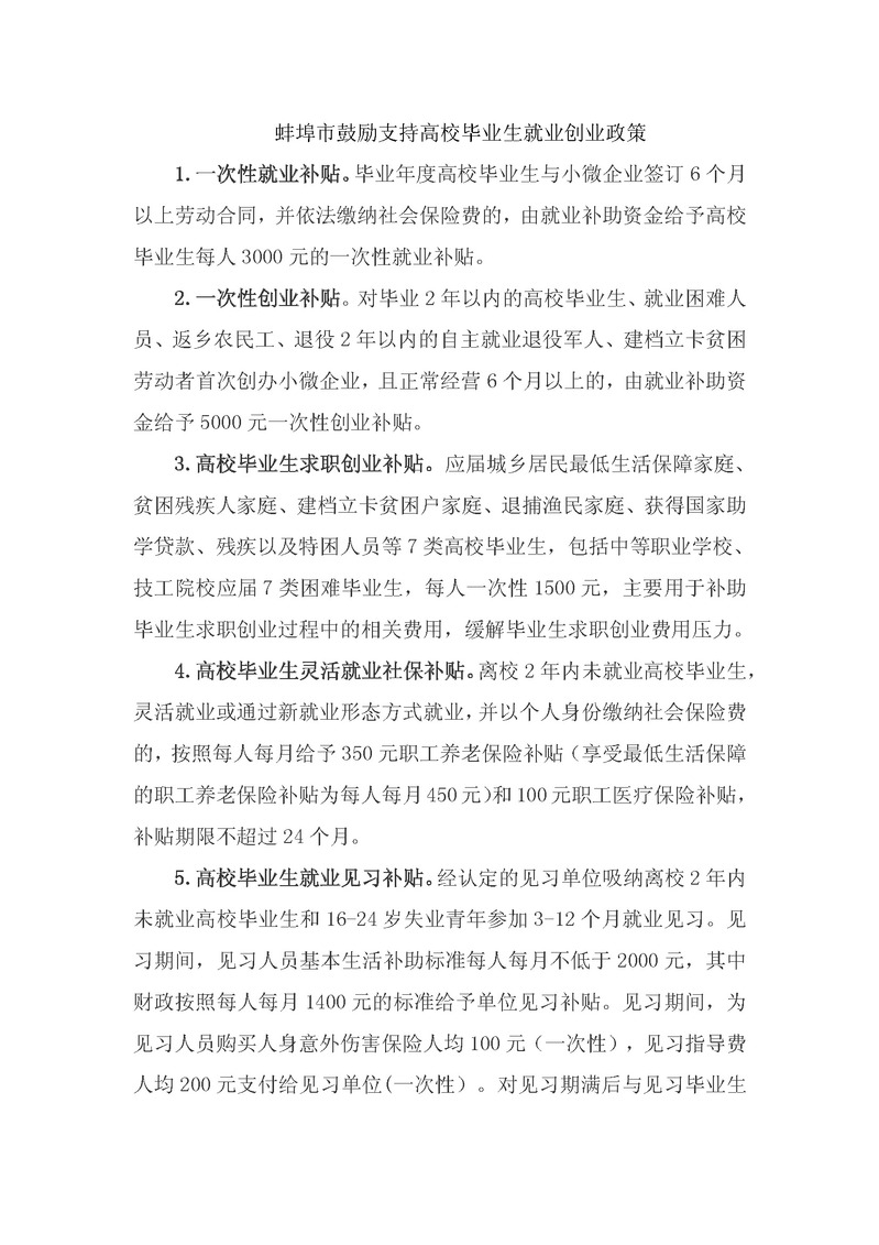 蚌埠市鼓励支持高校毕业生就业创业政策