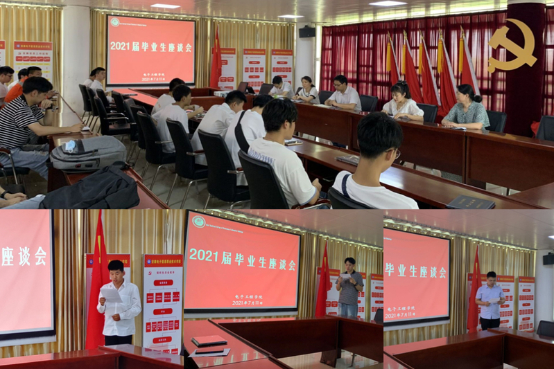 本网讯 7月11日上午,电子工程学院在3003B会议室召开了2021届毕业生代表座谈会,电子工程学院党总支书记、院长方庆山、副书记俞慧慧、副院长李征、教师党支部书记袁媛、学生党支部书记崔杉杉以及全体毕业班级学生代表参加了座谈会,会议由俞慧慧主持。