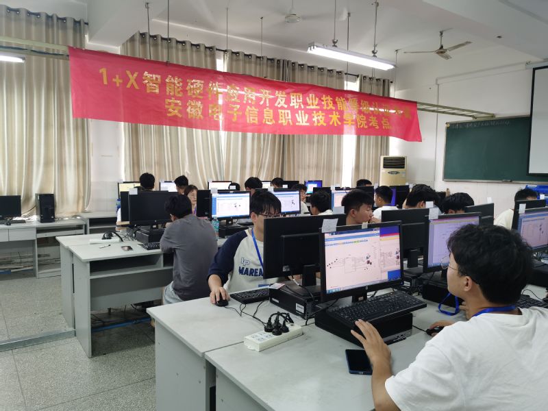 “1+X”智能硬件应用开发职业技能等级标准遵照“一贯穿、二反映、三增强、四融通”的原则,中级认证考试分为理论机考和实操考核两部分,综合检验学生STM32单片机编程应用、虚拟仿真、PCB设计和电路焊接等智能硬件应用开发相关的理论和技能。电子工程学院为此次1+X证书考核进行了充分的准备,在前期的课堂教学中,按照1+X职业技能等级证书考核标准要求,将课程教学标准与职业技能等级标准有机衔接,将课程教学内容与岗位工作内容深入融合,实现专业技能与岗位能力的对标。项目组在考前动员、考务培训和分工、考场布置和网络调试等多方面进行了精心筹备,圆满地完成了此次考核任务。