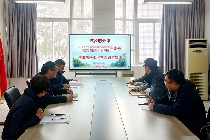 本网讯 3月6日下午,学院邀请中国兵器工业集团第二一四研究所传感器事业部副总经理、安徽北方华鑫智感科技有限公司业务负责人、学院集成电路技术专业产业教授焦贵忠研究员到校开展专业建设和校企合作工作交流,学院党总支书记、院长方庆山、副院长李征、应用电子教研室主任孟祥元和相关专业教师参加交流研讨。