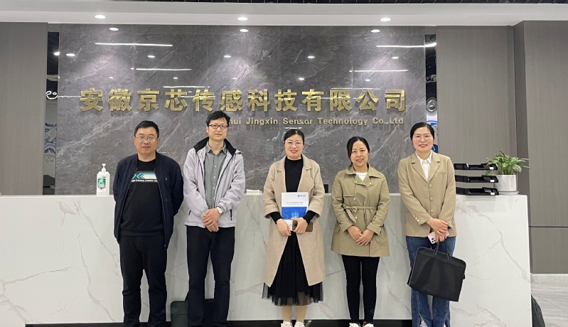本网讯 4月17日上午,电子工程学院副院长李征、应用电子教研室主任孟祥元、集成电路技术专业骨干教师余蓓敏前往安徽京芯传感科技有限公司、安徽积芯微电子科技有限公司开展访企拓岗促就业调研,蚌埠市企业发展服务中心主任吴敏、综合服务部部长王振、公共服务部部长张建磊参加调研。