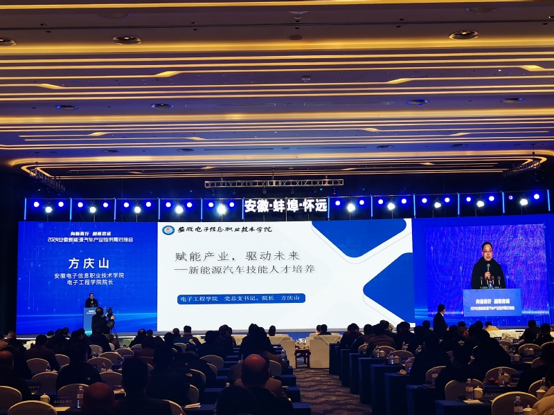 本网讯 12月13日上午,2024年安徽省新能源汽车产业链供需对接会在怀远县隆重举行。本次活动以“向新而行·融链致远”为主题,汇聚了安徽省内外10家整车制造企业、200余家汽车零部件企业,以及多所高校、科研院所和金融机构,旨在共同推动新能源汽车产业的深度融合发展。在会上,电子工程学院院长方庆山受邀作“赋能产业,驱动未来 新能源汽车技能人才培养”的主题推介发言。