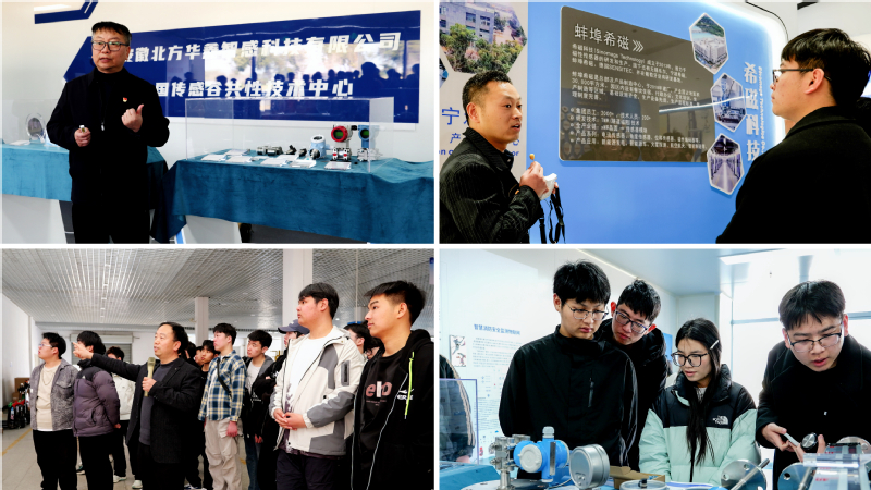 在中国传感谷,师生们分别走访了安徽北方华鑫智感科技有限公司、安徽禹芯半导体科技有限公司、安徽希磁科技股份有限公司和蚌埠金实科技有限公司。在安徽北方华鑫智感科技有限公司,总经理程晋阳详细介绍了公司在工业传感器等领域的研发成果,并带领师生们参观了高精度传感器生产线;在安徽禹芯半导体科技有限公司,副总经理李华东重点介绍公司在集成电路封装测试领域的技术成果,并向参观师生详细介绍了集成电路封装测试的实际流程;在安徽希磁科技股份有限公司,总裁办主任赵乾阳向师生们介绍磁性材料在新能源汽车、智能家电等领域的创新应用;在蚌埠金实科技有限公司,副总经理吴昊以新能源汽车电池生产全流程为主题,通过自动化生产线演示,让学生直观感受工业机器人、智能检测系统的实际运作场景。走访交流后,各企业均表示,未来将优先为学院毕业生提供技术操作、生产管理等岗位,并期待通过“学徒制班”“现场工程师班”等模式协同开展高技能人才培养,进一步深化校企合作。