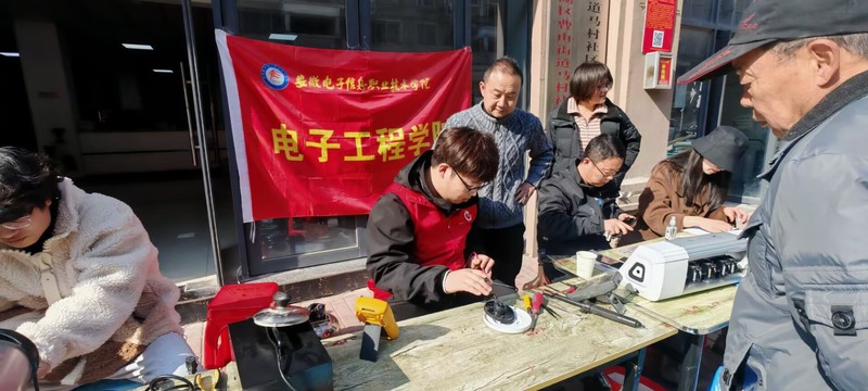 在马村社区门口的家用电器维修服务现场,维修台上整齐的摆放着电烙铁和万用表等维修工具,居民们带着有故障的电水壶、电风扇等家用电器赶来,整齐排队等待维修。大家迅速分工,耐心问询电器故障,精准检测线路,熟练更换零件,精细焊接维修,举止之间尽显师生们的专业技能水平。在活动现场,还特邀了学校应用电子专业校友、蚌埠vivo手机售后服务部负责人倪跃辉到现场,为居民开展免费手机贴膜志愿服务。现场有的负责引导、有的负责接待、有的负责维修操作,充满热闹温馨的氛围。金泽安老师还将电路分析课“搬”到工作现场,他一边维修,一边讲解电路原理,体现专业性的志愿服务。经过大家共同努力,损坏的十多件小家电重焕生机,三十多部手机重新换上了新膜。除了现场维修服务,师生们针对老年群体的特殊需求,还贴心推出上门检修、安全用电科普和 “一对一”专属指导等精细化服务,让居家老人们感受到科技带来的生活便捷。