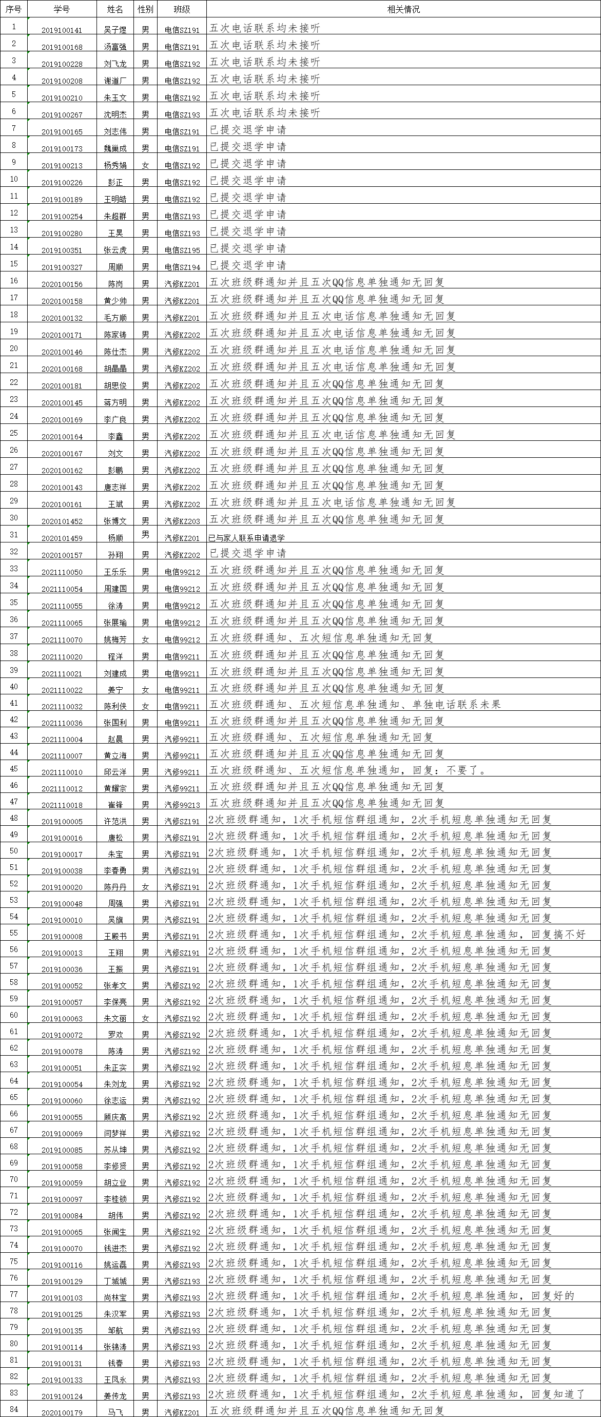 学院高职扩招生已按教学进程完成了开课,为进一步规范和完善高职扩招生的学籍管理工作,确保高职扩招生学籍处理符合相关规定,根据《必赢766net手机版学籍学历管理实施细则》规定,满足第九章第四十一条“(四)未经批准连续两周未参加学院规定的教学活动的;(七)本人申请退学的”等情形的,可予退学处理;在前期工作的基础上,结合学生本人意愿,拟将部分学生按退学处理,并予以公示,具体名单如下: