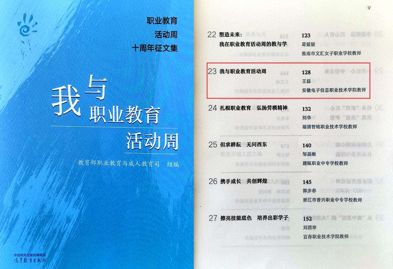 本网讯 在第十个全国职业教育活动周举办之际,由教育部职业教育与成人教育司精心编纂的《我与职业教育活动周》十周年征文集正式出版发行。电子工程学院王磊老师撰写的《我与职业教育活动周》主题征文获选入文集,是安徽省高职院校唯一入选文章。