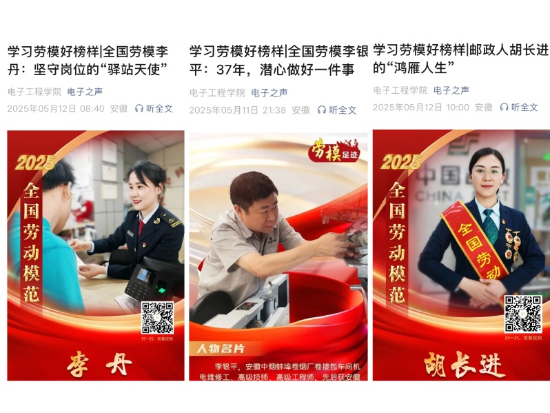 学习劳模,榜样力量浸润人心。在劳动教育宣传周期间,电子工程学院开设专题专栏,利用部门微信公众号、班级QQ群等平台集中宣传全国劳动模范李丹、胡长进、李银平的劳动事迹,加深学生对劳动的正确认识与理解,传承与弘扬劳动精神,营造崇尚劳动、尊重劳动的浓厚氛围。