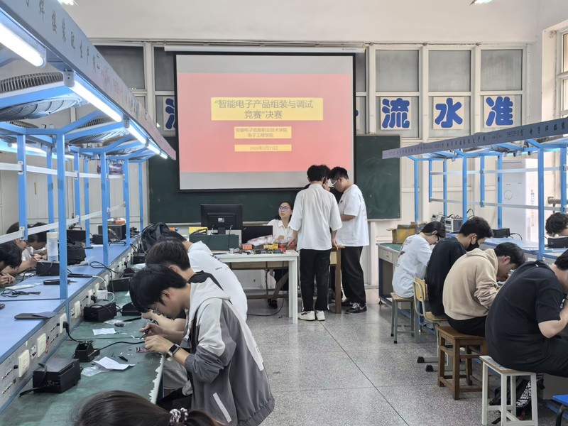 本网讯 5月15日下午,由电子工程学院承办的2025年“智能电子产品组装与调试”校赛决赛在1102实训室圆满落幕。本次比赛采用初赛、决赛两阶段赛制。初赛于5月11日在1102、2101两个实训室举办,吸引了电子信息工程技术、现代通信技术、应用电子技术、集成电路技术、光伏工程技术等专业的80余名选手踊跃报名。经过初赛的严格选拔,最终40名表现优异的选手脱颖而出,成功晋级决赛。在历时2小时的决赛激烈角逐中,选手们充分展现了精湛的专业技能,最终电信233班杨梦想、电信231班孙晓峰等24名同学凭借出色的综合表现,分别斩获一、二、三等奖。