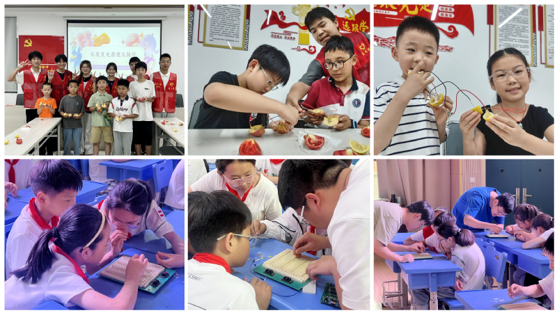在活动中,团队成员利用电子信息专业知识,设计了“水果发电实验”和“在面包板点亮LED灯”趣味科普活动,让百余名中小学生在动手实践中探索电学奥秘。“水果也能发电?”带着这样的疑问,孩子们在学生志愿者的引导下开启了“水果发电实验”。当锌片、铜片插入柠檬、苹果,再用导线连接 LED 灯使其发光时,孩子们兴奋地围在一起交流讨论。志愿者通过对比不同水果的发电效果,用形象生动的语言解释电池原理,将深奥的科学知识转化为孩子们易于理解的趣味讲解。在“面包板点亮 LED 灯”活动中,志愿者们耐心细致地讲解电路知识,小学生们在实践团成员的指导下,第一次接触电阻、LED灯等电子元器件,在大学生的指导下将器材搭建电路并点亮LED。活动中,孩子们的脸上洋溢着成功自豪与喜悦。