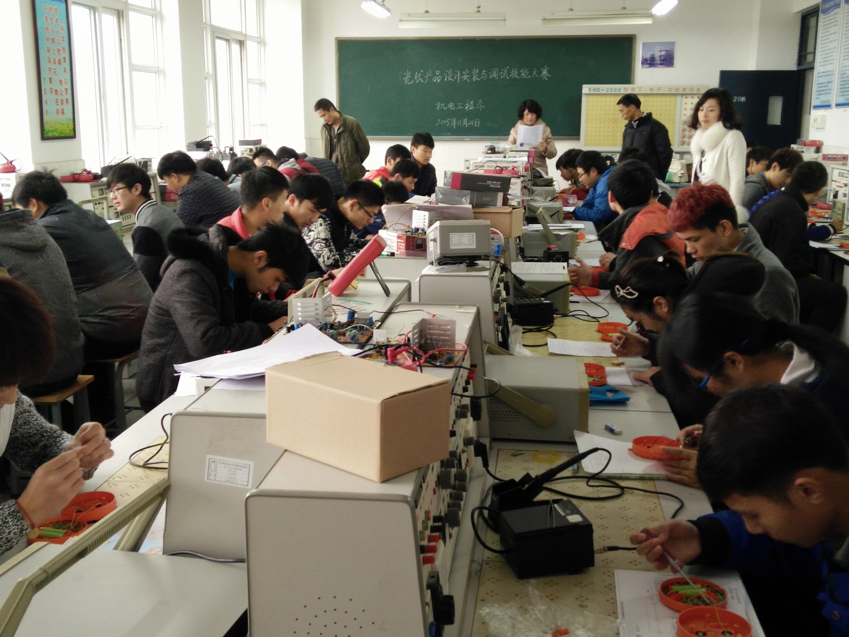 机电工程系能源应用教研室于2015年11月21日周六上午8点30分在教三楼3206实训室举办了“光伏产品设计、安装与调试”技能大赛。本次竞赛面向全系、立足新能源应用专业,对于开设《光伏应用技术》、《光伏组件生产》课程的学生,都可以参赛。通过本次竞赛,检验参赛队员的计划组织能力、光伏系统及其对应的产品设计、安装与调试能力、职业素养、效率和安全意识。根据职业岗位对职业能力要求,引导高职院校新能源类专业强化专业基本技能训练和综合实训教学改革发展方向,促进工学结合人才培养模式改革与创新,系统培养新能源专业类行业所需的高端技能型人才,达到“以赛促教、以赛促学”的目的。同时希望通过本次大赛培养和发现人才,为参加省级风光互补发电系统安装与调试职业技能大赛选拔队员。