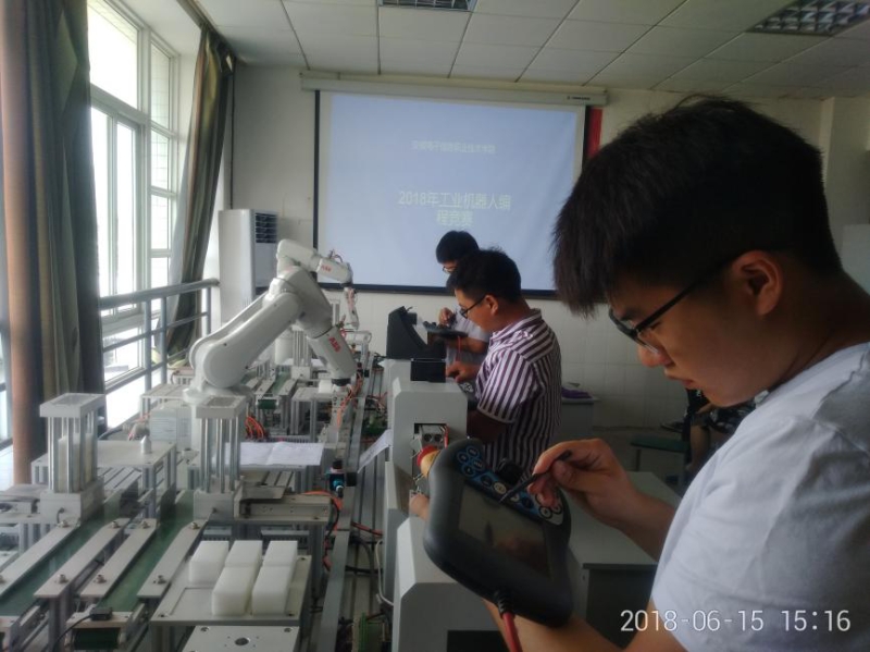 本网讯为了加强实践动手能力,使课程教学与工程实践相结合,检验和展示我系机器人专业及其相关专业学生对工业机器人编程、分析、解决问题的能力,2018年6月15日下午,机电工程系在工业机器人编程实训室组织开展了“2018年工业机器人编程竞赛”。