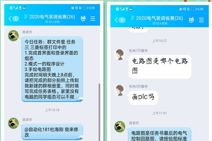 “今日任务:群文件里任务三……请把完成的部分拍照上传到我新建的群相册里,同时填写完成任务表格”,“电路图是哪个电路图,PLC吗?”这是2月10日“2020电气装调省赛”辅导QQ群里的聊天内容,路月潭在给她辅导的备赛学生布置训练任务,董伟在请教问题。