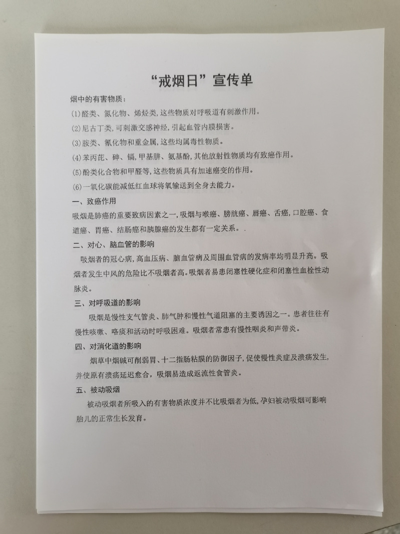 作为一场“戒烟”活动,四栋楼的每层楼厕所成为了志愿者们重点排查地点。很多喜欢吸烟的同学下课都会跑到厕所里吸烟,这时志愿者们就会上前阻止吸烟,并发一张“戒烟”宣传单给他们。