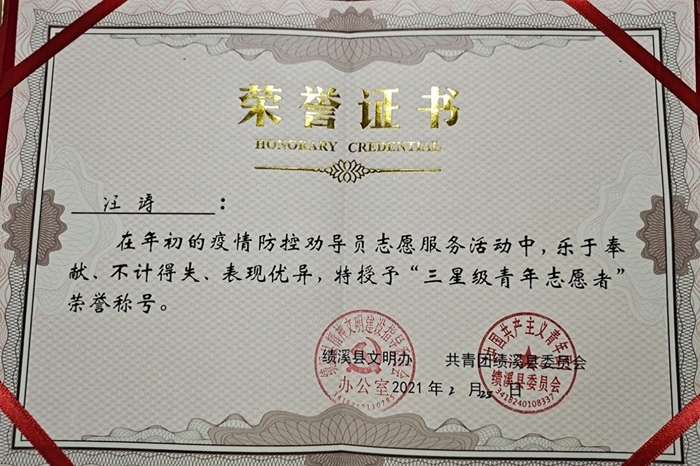 3月初,系部团总支开展“学习雷锋好榜样”主题宣传活动,选树寒假实践活动中的优秀学生代表,依托系部网站、公众号等网络平台宣扬雷锋精神。其中,自动化201班的汪涛同学,利用寒假时间参加家乡绩溪县的疫情防控引导活动,成为一名光荣的疫情防控劝导员,被授予“三星级青年志愿者”荣誉称号。