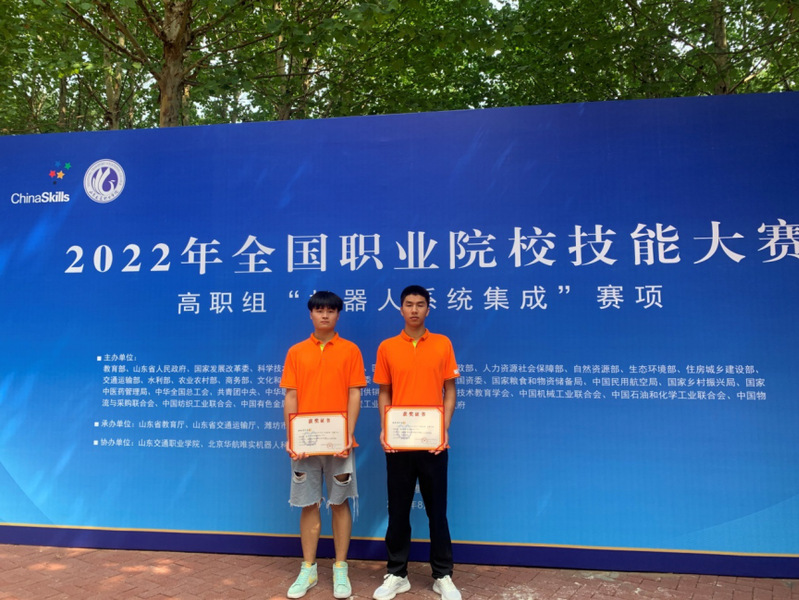 8月15至18日,2022年全国职业院校技能大赛高职组“机器人系统集成”赛项于山东省潍坊市山东交通职业学院举办,来自全国28个省市、自治区的52支参赛队共104名选手参加了此次比赛。由机电工程学院周颀、乔志杰2位教师指导的姚灿、孙杰2位同学组成的参赛团队荣获大赛三等奖。