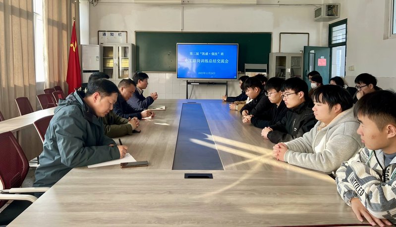 本网讯 为确保第二届“凯盛·强技”班跟岗训练高质量实施,做好本次跟岗训练总结提高、下阶段跟岗训练再谋划,机电工程学院于11月24日下午,在4401会议室召开了第二届“凯盛·强技”班电工跟岗训练总结交流会,机电工程学院党总支书记、院长郝志廷,党总支副书记赵世同出席会议,智能制造教研室主任查正卫主持会议,班级辅导员高军、跟岗训练企业导师蒋洪年和全体学生参加会议。