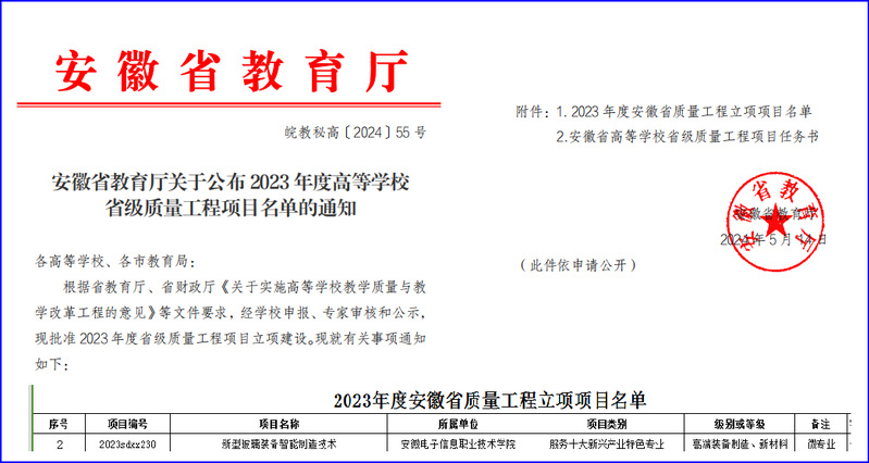 本网讯 近日,安徽省教育厅公布了2023年度高等学校省级质量工程项目及微专业建设名单,学院申报的《新型玻璃装备智能制造技术微专业成功获批立项。