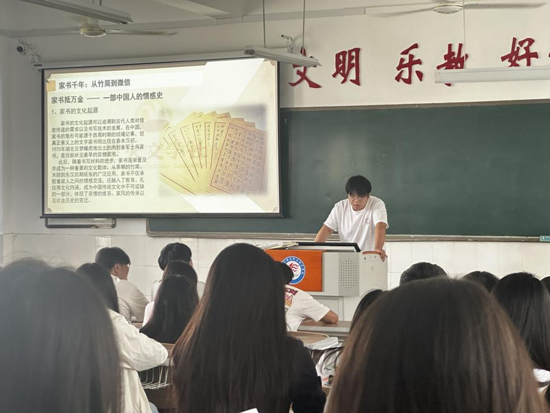 活动伊始,吴灿以家书承载的文化传承为切入点,从西周时期的结绳记事讲起,沿着历史脉络,生动梳理了家书从竹简木牍到现代电子文本的演变历程,让同学们深切感受到家书作为文化载体的厚重底蕴。他特别指出,在微信秒回的快节奏时代,家书的“慢表达”更能沉淀情感,其手写特质承载着家族记忆,也是家庭教育的重要媒介。