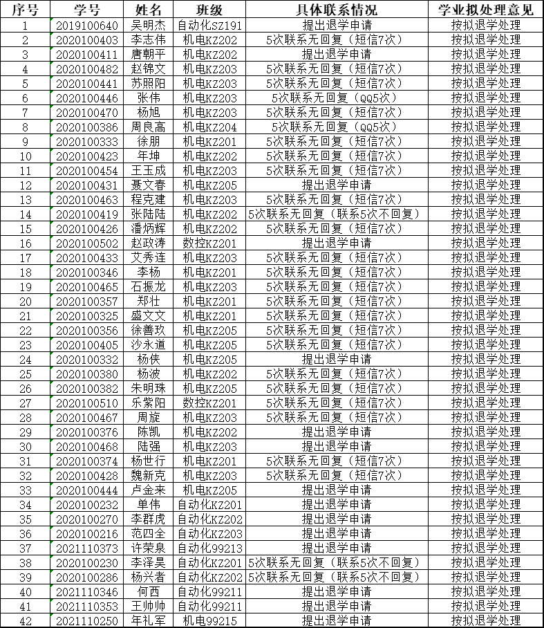 学院2019年至2021年(共计三个年级)的高职扩招生已按教学进程完成了开课,为进一步规范和完善高职扩招生的学籍管理工作,确保高职扩招生学籍处理符合相关规定,根据《必赢766net手机版学籍学历管理实施细则》(以下简称《细则》)规定,满足第九章第四十一条“(四)未经批准连续两周未参加学院规定的教学活动的、(七)本人申请退学的”等情形的,可予退学处理”等有关规定;在前期工作的基础上,结合学生本人意愿,拟将部分学生按退学处理,并予以公示,具体名单如下: