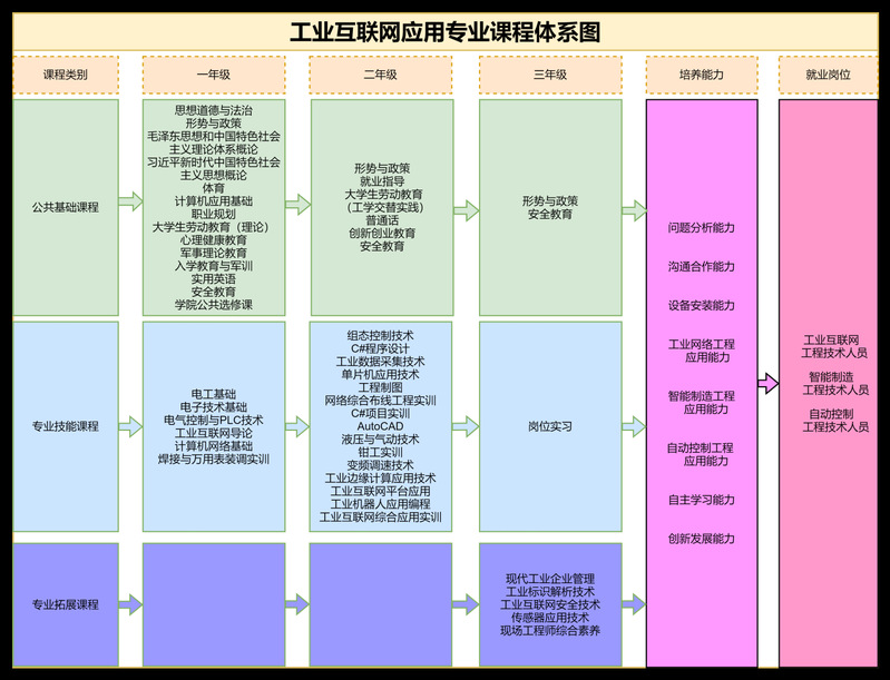 工业互联网应用专业课程体系中包含三类课程:公共基础课程、专业技能课程、专业拓展课程。