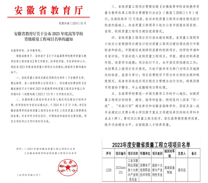 本专业是也安徽省“双高计划”“双特色”建设高校重点建设专业群内专业, 依托省级智能制造产业学院,对接安徽省十大新兴产业之一的高端装备制造业,服务装备制造行业高技能人才需求,融入新型玻璃装备智能制造技术微专业特色课程。工业互联网应用服务十大新兴产业特色专业项目已于2024年获批立项。