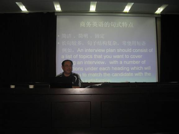 2010年6月11日,经济管理系邀请安徽财经大学外国语学院周平院长(博士)来我院为商务英语专业的师生进行了一场精彩的讲座。针对商务英语专业,周平博士从商务英语的语言特点、词汇特点、句子特点、文章结构特点等方面进行了概括性探讨。周平博士用词准确精湛、语言幽默风趣,通过生动、直观的例子,把晦涩难懂的理论阐述得清楚易懂,不时赢得师生的热烈掌声。