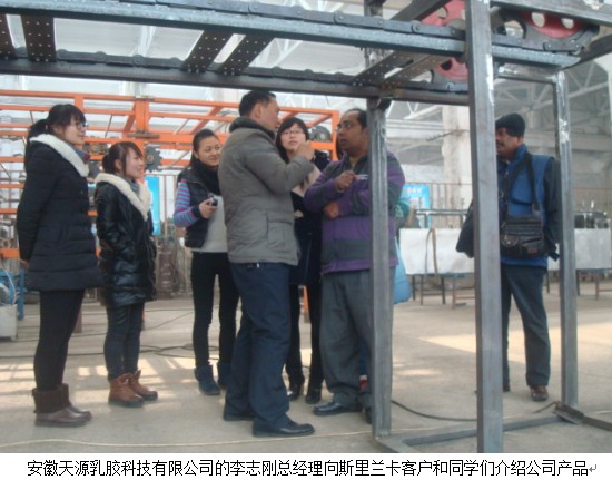 随后,安徽天源乳胶科技有限公司的李志刚总经理带领斯里兰卡客户和同学们参观了车间,介绍了生产的流程、技术等情况。同学们的优秀表现给客户留下了良好的印象,最终促进达成了此笔业务。斯里兰卡客商Weliwita说:“We will buy the production line.”(我们将买这个生产线。)