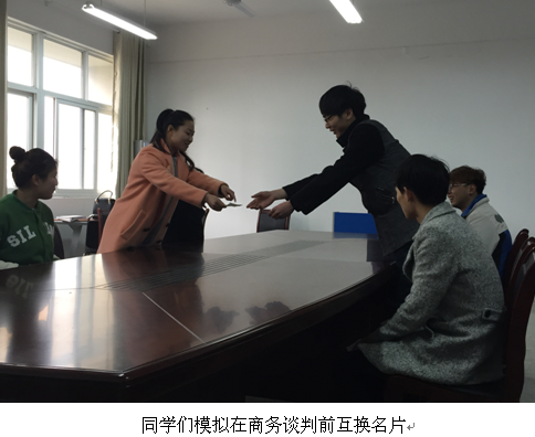 为提高课堂教学质量,改进课堂教学方法,创造教师相互借鉴、相互学习、沟通交流的机会,2015年3月20日上午8:00—9:40外经贸教研室全体教师在信息楼商务谈判实验室(中218)对关红燕老师的《商务谈判》课程进行观摩听课活动。本节实训课的内容是“商务谈判前的自我介绍”。关红燕老师做了充分的教学准备工作,精心组织教学,通过教师示范、小组讨论、模拟商务谈判前的自我介绍等实训环节,达到了良好的实训教学效果。