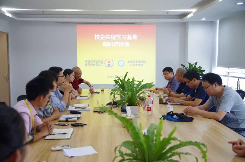 本网讯  为进一步加强校企文化交流,深化校企合作,7月27日,经济管理系赴安徽汇通金融数据服务有限公司开展调研。经济管理系副主任乔刚带领系副主任项西国、财经教研室主任陈克军、暑期实践指导老师周二鹏参加调研,汇通金融公司潘春森总经理热情欢迎调研组的到来。