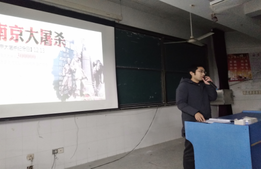活动中,主持人介绍了“南京大屠杀”的历史背景,80年前的今天,侵华日军攻陷南京城,进行了长达数月的大规模屠杀,夺取了三十万人无辜的生命。这场震惊中外的“南京大屠杀”直至今天,都让人久久不能释怀。黄浩发言讲到:“不管是八零后,还是九零后在历史面前我们都是中国人,我们要时刻谨记,勿忘国耻。”今天的中国是世界和平的坚决倡导者和有力捍卫者,中国人民将坚定不移维护人类和平与发展的崇高事业。