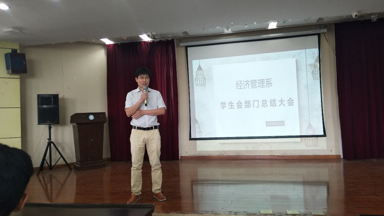 本网讯 5月2日中午,经济管理系学生会在2002c举办部门工作总结大会,参与此次大会的有党总支副书记赵世同、团总支黄浩老师、经济管理系全体学生会干部及干事。