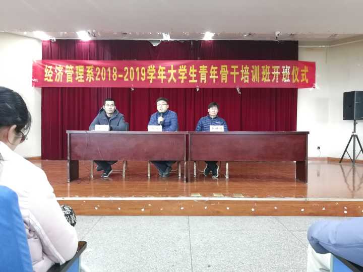 本网讯 12月6日,经济管理系在2002C举办2018-2019学年大学生青年骨干培训班开班仪式。出席本次活动的有:经济管理系主任乔刚、党总支副书记赵世同、团总支负责人黄浩老师。参加活动的还有参与大骨班培训的全体人员。