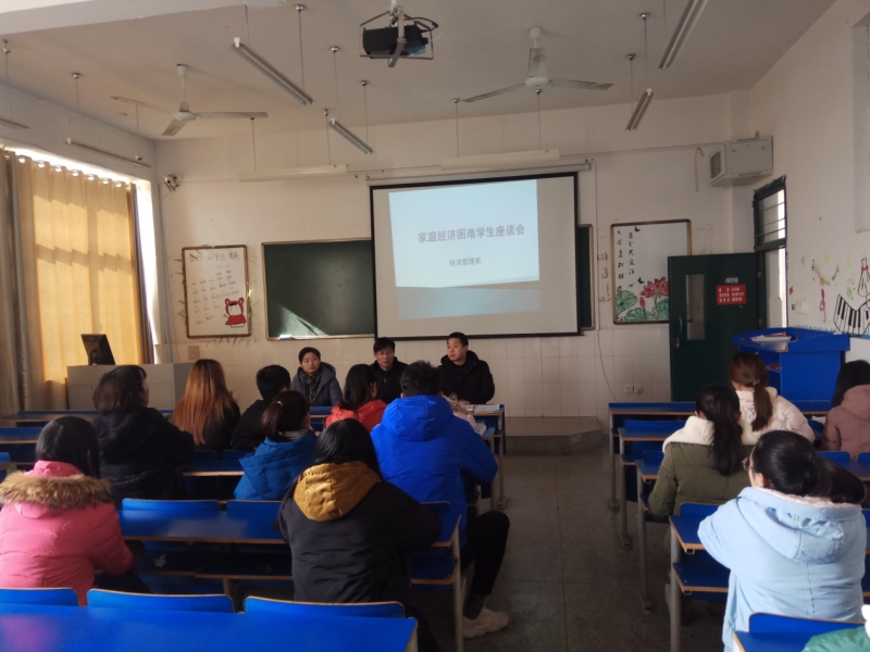 本网讯12月4 日经济管理系在5409教室召开困难生座谈会。会议由系资助工作负责人,2017级年级辅导员何云春老师主持,系党总支副书记赵世同,2018级年级辅导员朱慧老师出席座谈会,2017级和2018级各班级助学金获得者代表参加会议。