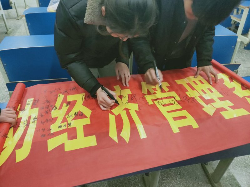 本网讯 12月20日,经济管理系在五栋经济管理系教学楼举办诚信考试签名活动。参加本次活动的有经济管理系学习部部长李子文,学习部干事和办公室部门干事,以及经济管理系各个班级同学们。