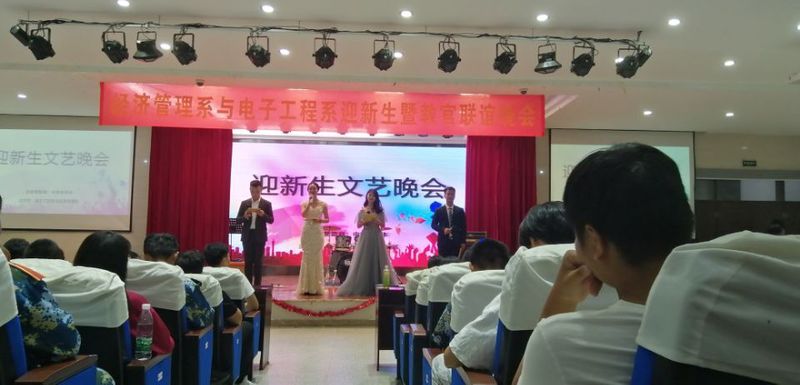 本网讯 9月12日晚,电子工程系与经济管理系联合举办的迎新生晚会在学术报告厅隆重举行。经济管理系党支部副书记赵世同、电子工程系副主任刘涛、经济管理系副主任项西国出席晚会,电子工程系与经济管理系全体2019级辅导员及部分新生参加此次活动。