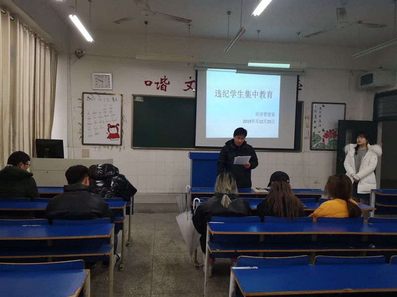 本网讯 为加强学风建设,督促违纪学生杨成良好的学习和生活习惯,12月25日下午在5409开展对违纪学生集中警示教育活动。会议由经济管理系副书记赵世同主持,涉及班级辅导员及违纪学生参加了教育活动。