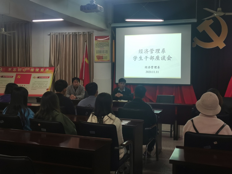 本网讯 为进一步提高学生干部管理水平,协助系部做好学生管理工作,11月11日下午五点半,经济管理系在3003C召开学生干部座谈会,会议由党总支副书记赵世同主持,专职辅导员韩向军、团总支负责人方玥以及主要学生干部参加了座谈会。