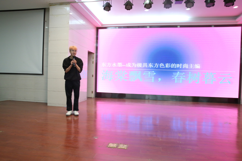 获得亚军的电商201班屈熊同学以《山水泼墨中的时尚之路》为题,以成为极具东方色彩的时尚主编为职业理想,将中国最深的传统美学与现代摩登时尚结合,将他对时尚与中国传统文化相结合的观念与想法表达得唯美、生动,获得评委一致好评。