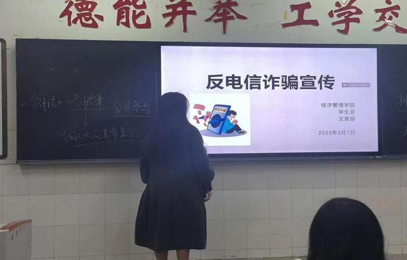 经管学院各班级普遍召开了防电诈主题教育班会,辅导员围绕什么是电信诈骗,如何预防电信诈骗等,向同学们做了深入浅出的宣讲。通过宣传教育,同学们掌握了防范电信网络诈骗的基本知识,进一步增强了反诈防骗的意识。