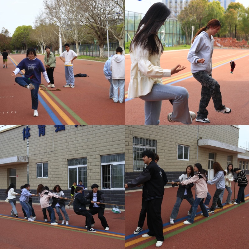 主题活动分为趣味跳绳、拔河和踢毽子三项。首先进行的是趣味跳绳和踢毽子比赛。只见二名同学奋力甩动手中的跳绳,其余的同学加快双脚的跳跃,比赛场面十分热烈。在拔河比赛现场,随着一声哨响,气氛迅速变得紧张激烈起来,大家心往一处想,劲往一处使,齐心协力、奋力拼搏。现场的观众激情呐喊,纷纷为各组队员们加油助威。一时间加油声、呐喊声、欢笑声此起彼伏,激情与紧张同在,友谊与竞争共存。大家相互配合,在欢声笑语中充分享受运动会带来的放松与快乐。