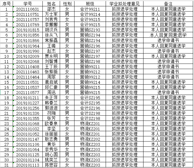 学院2019年至2021年(共计三个年级)的高职扩招生已按教学进程完成了开课,为进一步规范和完善高职扩招生的学籍管理工作,确保高职扩招生学籍处理符合相关规定,根据《必赢766net手机版学籍学历管理实施细则》(以下简称《细则》)规定,满足第九章第四十一条“(四)未经批准连续两周未参加学院规定的教学活动的、(七)本人申请退学的”等情形的,可予退学处理”等有关规定;在前期工作的基础上,结合学生本人意愿,拟将部分学生按退学处理,并予以公示,具体名单如下: