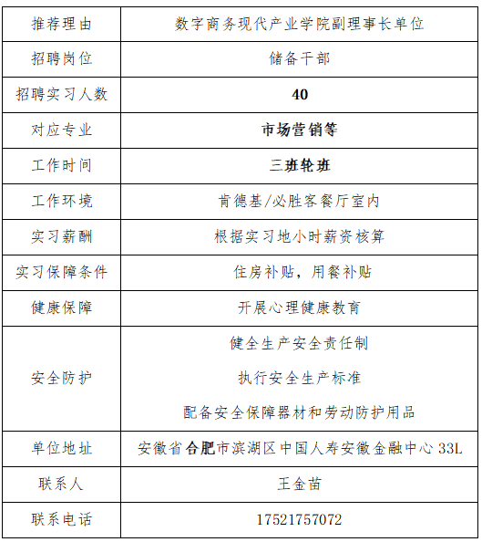 经济管理学院岗位实习单位推荐:百胜餐饮(安徽)有限公司