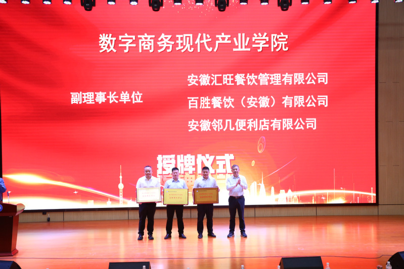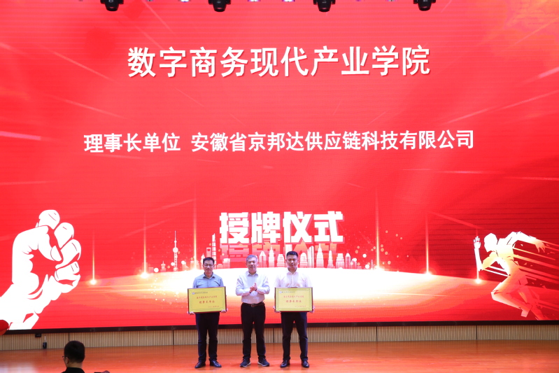仪式现场,王国武与企业家们共同为数字商务现代产业学院揭牌,现场掌声雷动,气氛热烈。随后,王国武为理事长单位和副理事长单位授牌。学院与安徽省京邦达供应链科技有限公司举行了合作签约仪式,就人才培养、实践教学、实习就业等方面达成了具体合作意向。仪式结束后,京东物流华东地区用工保障中心负责人、产业教授许闪光为广大师生带来了一场主题为《中国互联网电商发展》的精彩讲座。