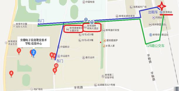 2.交通安排 (1)蚌埠南站(高铁站) 乘坐128路、138路在蚌埠医学院南门 学府路·龙湖春天站(路北)下,马路对面即是住宿酒店。 (2)火车站(蚌埠站) 乘坐128路在蚌埠医学院南门 学府路·龙湖春天站(路南)下,车站旁边即是住宿酒店。 (3)汽车总站 乘坐128路在蚌埠医学院南门 学府路·龙湖春天站(路南)下,车站旁边即是住宿酒店。