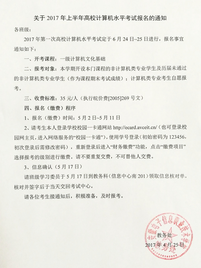 关于2017年上半年高校计算机水平考试报名的通知