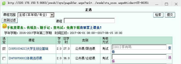 6.选择相应专业(默认本专业)——>点击“检索”按键 ——>选定某一课程 ——>点击“选择”;