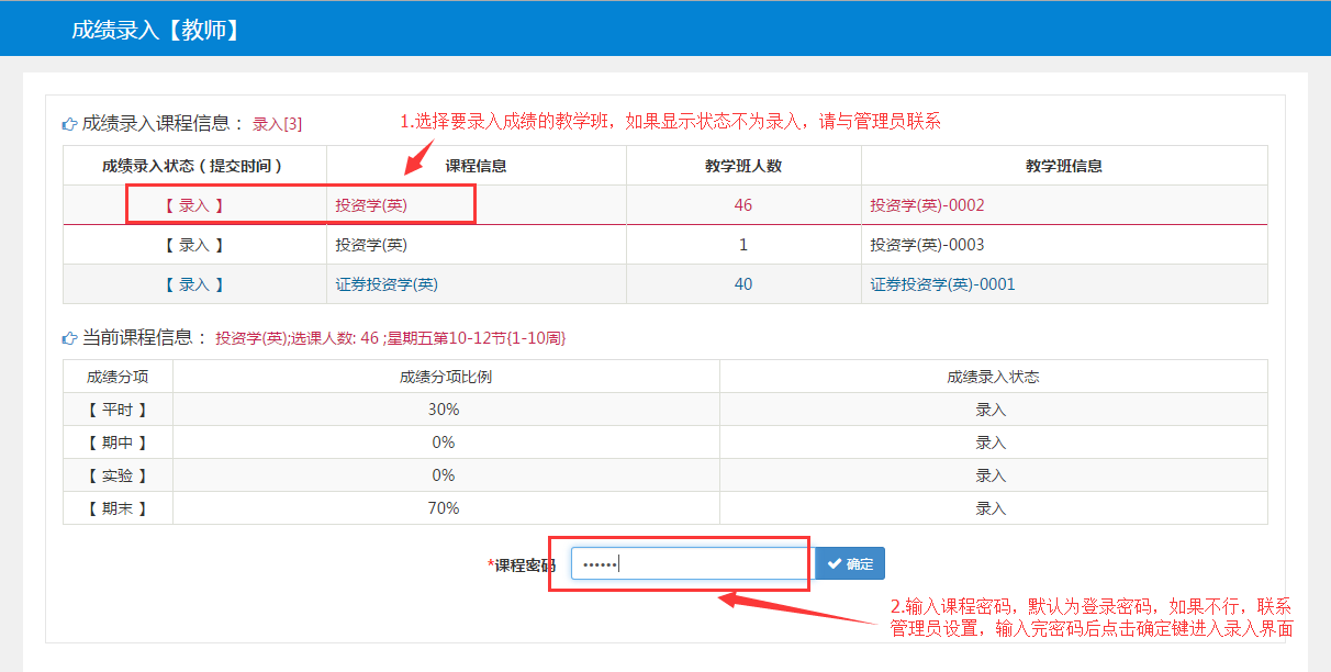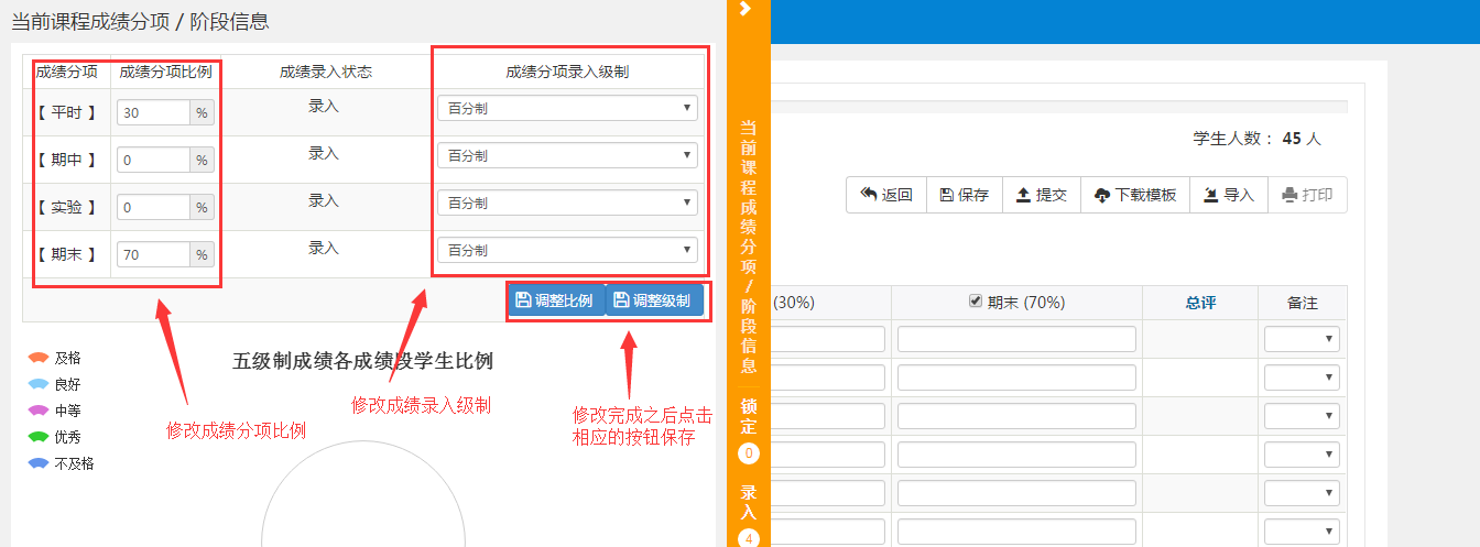 如果该教学班已经录入过成绩,需要进入到教学班录入界面(具体路径看步骤二),进入教学班录入界面后,点击左侧黄色框,在里面修改比例和级制。