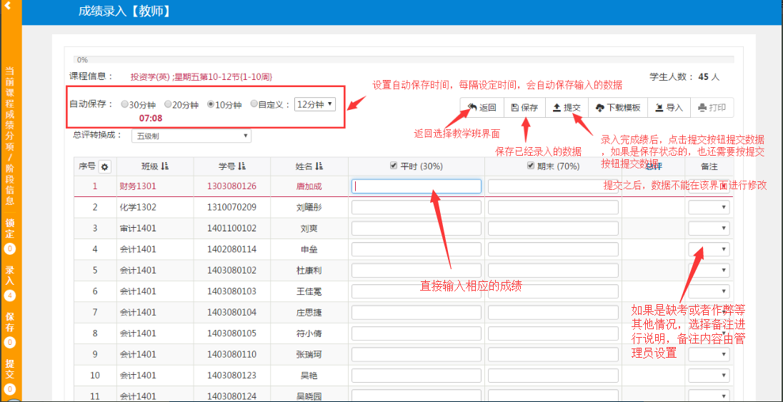注意:成绩输入完成之后按提交按钮提交成绩,提交后成绩在这个界面不能在修改。
