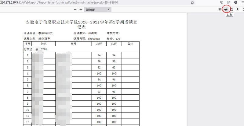 4. 行政班打印界面点击右上角标①处按钮(“打印-打印(客户端)”)(注意不要直接勾选左边标②处按钮),进入打印界面,直接点击右上角打印按钮即可。